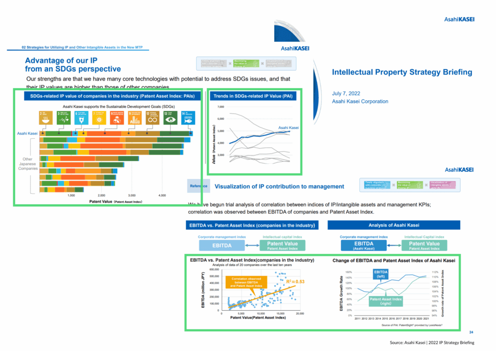 Asahi Kasei (Japan): 투자자 프레젠테이션에서 특허 분석을 활용하여 폴리머, 전자, 헬스케어 기술 분야에서의 리더십을 강조합니다.