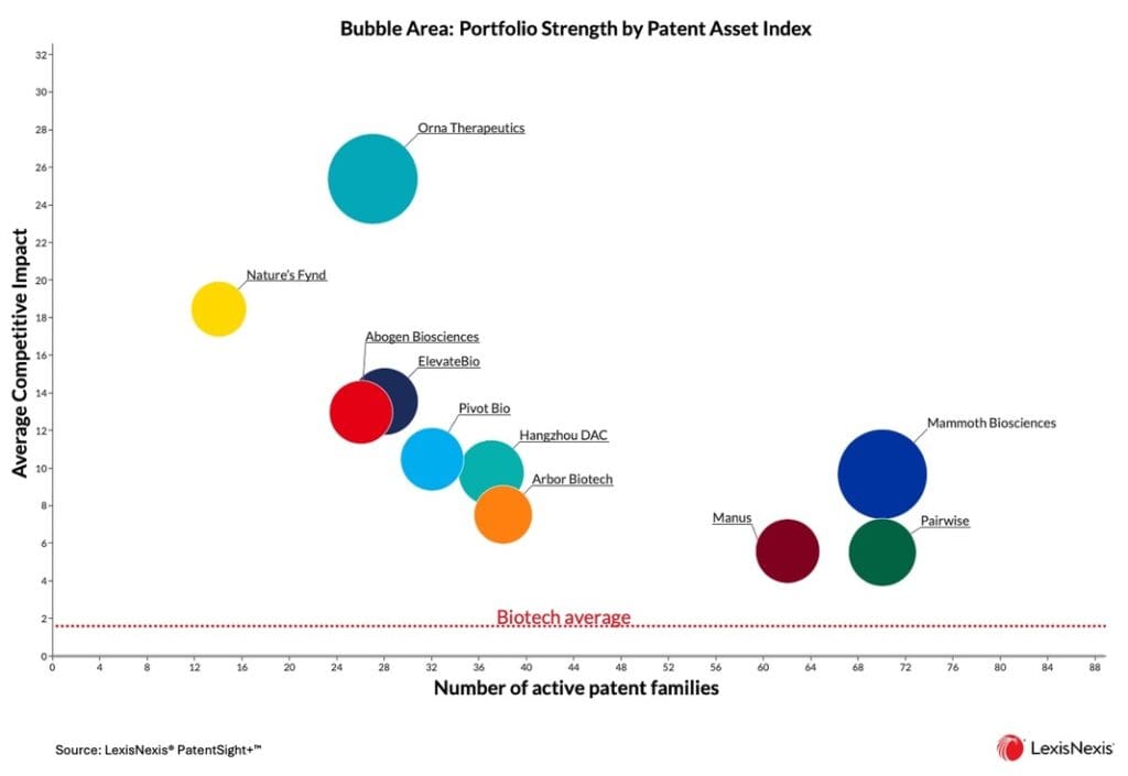 Orna Therapeutics 는 비교적 작은 포트폴리오 규모에도 불구하고 가장 높은 평균 경쟁 영향력과 전반적인 특허 강점을 자랑합니다. 반면, Mammoth Biosciences는 포트폴리오 규모에서 선두를 달리고 있으며, 전반적으로 상당한 강점을 유지하고 있습니다. Nature’s Fynd또한 소규모 포트폴리오와 뛰어난 특허 품질을 결합하여 두각을 나타내고 있습니다. Abogen Biosciences, ElevateBio, Pivot Bio등 몇몇 기업은 탄탄한 포트폴리오 규모와 평균 이상의 경쟁적 영향력을 결합하여 균형 잡힌 접근 방식을 보여줍니다. Hangzhou DAC와 Arbor Biotech는 IP 역량을 효율적으로 강화하는 기업으로 자리매김했습니다. Manus 는 더욱 광범위한 특허 기반을 바탕으로 성장하고 있는 것으로 보입니다. 이러한 역동성은 생명공학 스타트업들이 지식재산권을 통해 경쟁 우위를 확보하기 위해 다양한 전략적 경로를 취하고 있음을 보여줍니다.