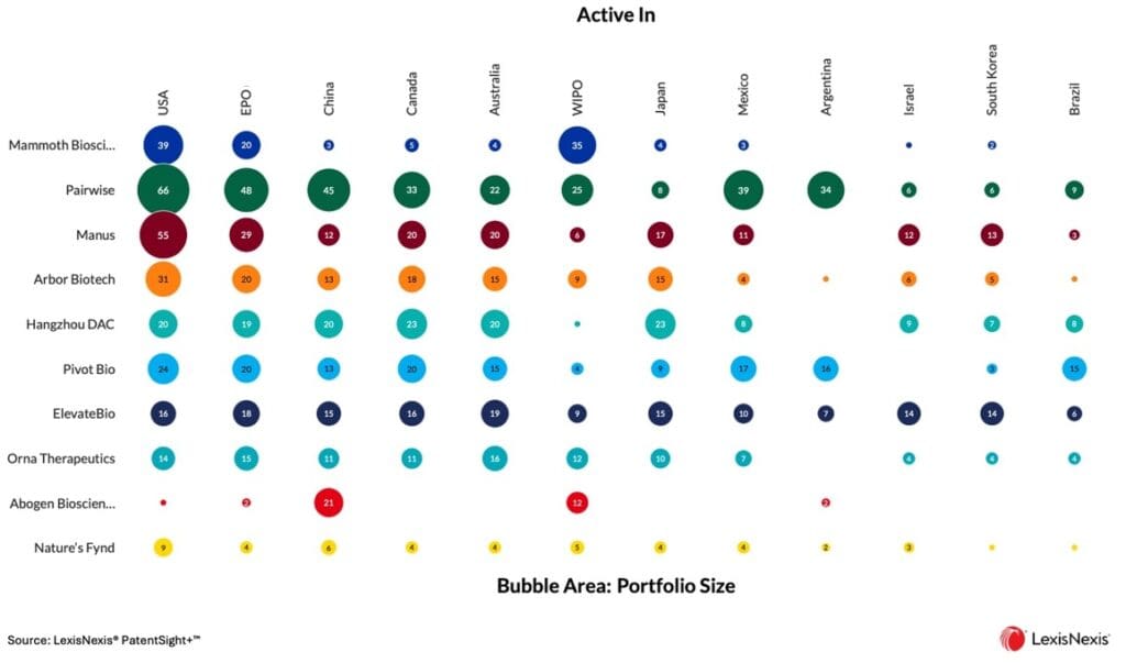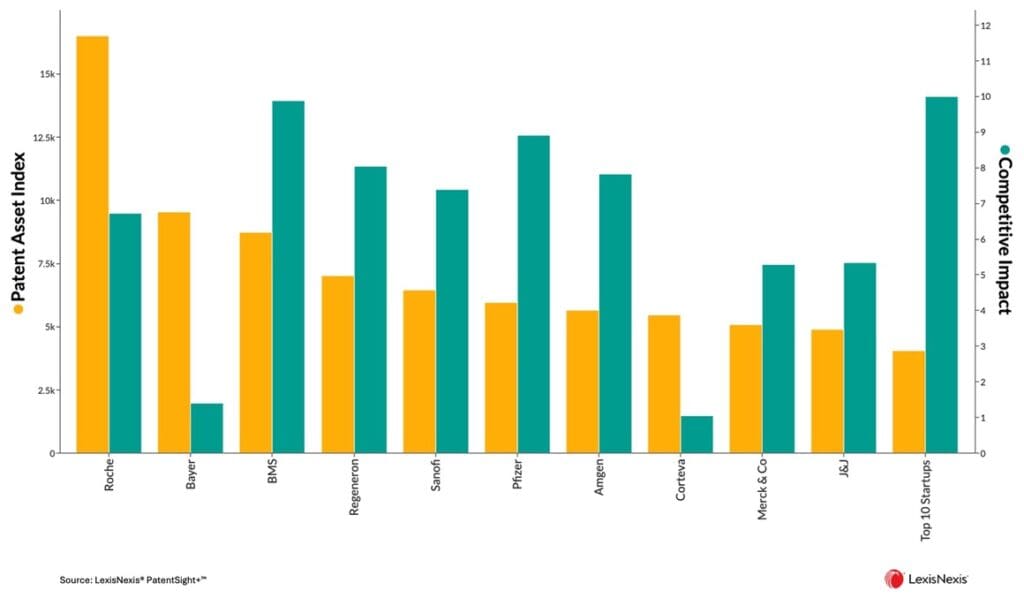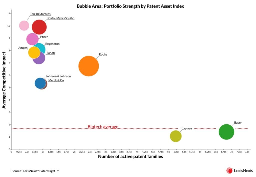 이러한 신흥 기업들의 진정한 규모를 평가하려면 적색, 녹색, 백색 바이오테크 분야의 기존 업계 선도 기업들과 비교 분석하는 것이 도움이 됩니다. 이러한 신생 스타트업의 혁신 규모를 살펴보면, Mammoth Biosciences가 보유한 가장 강력한 개별 스타트업 포트폴리오는 해당 분야의 선도적 기업 특허 보유자인 Roche의 강점의 10분의 1에 불과합니다.