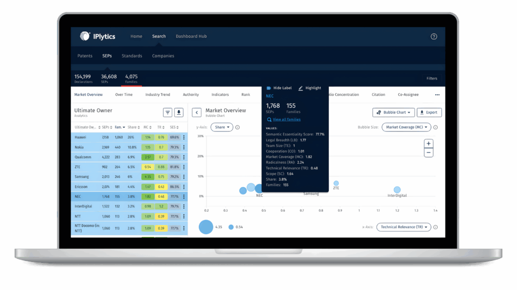 홈 > IP 솔루션 > IP 분석 및 정보 > IPlytics A lawyer or a judge advisor works in the legal concept office. 표준필수특허 및 표준 기여의 세계 탐색하기 LexisNexis® IPlyticsTM를 통해 표준 필수 특허(SEP), 기술 표준 및 기여 데이터 분석에 대한 투명하면서도 접근성 높은 데이터를 활용하여 특허 포트폴리오의 성공을 보장하십시오. 데모 요청 특허 및 표준 데이터를 바탕으로 한 심도있는 비즈니스 의사결정 실현 특허 전문가는 IPlytics의 신뢰성 있고 사용자 친화적인 SEP, 기술 표준 및 기여데이터에 대한 분석을 통하여 특허 포트폴리오의 성공을 실현할 수 있습니다. 정보에 기반한 의사결정을 내리고 성공을 이루는 데 도움이 되는, 투명하면서도 이해하기 쉬운 인사이트에 액세스하십시오. 동영상 시청 5G 특허 경쟁은 누가 주도하고 있는가? Cellular Verified Initiative에서 제공하는 검증된 특허 분석을 통해 5G 혁신의 진정한 선두주자와 2026년 특허 현황을 알아보세요. Read the Report Blue rays of light through the smoke from the projector. Lighting equipment. Show, performance, concert or night club. Abstract Background 시멘틱 유사성 스코어 (Semantic Similarity Score) 특허 필수성을 판단하기 위한 첫번째 단계 IPlytics 시멘틱 유사성 스코어(Semantic Essentiality Score)는 특허가 해당 특허의 선언 기준에 대해 어느 정도의 필수성을 가질지 안내합니다. 필수성 점수는 표준 섹션에 대한 독립 특허 청구항의 의미론적 매핑을 사용하여 1~100점 사이로 계산됩니다. 100점에 가까울수록 필수성이 높은 것입니다. Blue rays of light through the smoke from the projector. Lighting equipment. Show, performance, concert or night club. Abstract Background 미선언된 특허 유니버스 (Undeclared Patent Universe) 동영상 코딩 특허의 모든 환경을 한곳에서 파악 IPlytics는 AVC, HEVC 및 VVC 동영상 코딩 생성에 필요할 수 있는 미공개 특허가 포함되도록 데이터베이스 솔루션을 확장했습니다. 상세 정보 확인 데이터 중심 의사결정의 복잡성 극복 표준필수특허 전 세계 표준에 선언된 특허의 특허권 정보에 액세스하십시오. 표준 기여 표준에 대한 회사의 기술 투자를 살펴보십시오. 특허소송사례 특허 소송 사례를 살펴보며 특허받은 기술과 관련된 시장 분쟁에 대한 인사이트를 확보하십시오. 특허 풀 SEP로 보호되는 기술의 접근성에 대한 정보를 확보하십시오. 의미론적 필수성 선언된 특허의 표준 필수성을 판단하십시오. 당사가 인사이트를 제공하는 산업 분야 통신 다양한 표준별 선언된 SEP 랜드스케이프 현황을 파악하고, 각 SEP 소유자 포트폴리오의 필수성을 알아봅니다. 자동차 리스크 노출도를 빠르게 파악합니다. 라이선스 부여자와 동일한 데이터 및 지표를 사용하여 라이선싱 협상에서 공정하게 경쟁합니다. 소비자 가전 불필요한 리스크를 피하고, 이와 동시에 연결된 제품의 다음 출시를 준비할 수 있도록 연결성 표준 및 특허 랜드스케이프를 모니터링합니다. 로펌 특허 소송 지원, 추가 고객 서비스 프로젝트 및 질문에 대하여, 동적인 실시간 SEP 데이터를 간편하게 활용함으로써 모든 관련 SEP 사안에 대한 선도적인 전문가로서의 역할을 구축할 수 있습니다. 특허 풀 포트폴리오를 효율적으로 평가합니다. 가치 있는 자산을 활용하여 새로운 특허 풀 멤버를 선제적으로 찾습니다. IPlytics 플랫폼을 둘러보고자 하십니까? 하기 정보를 입력하신 후 제출해 주세요. 이 특허 인텔리전스 플랫폼은 FRAND 라이선스 협상에서 우위를 점하도록 지원하며, 의사결정을 내리기 전에 필수성이 어느 정도일지 판단하는 데 도움이 됩니다. 최고의 전문가가 IPlytics를 사용하는 방법 SEP 특허권자 (SEP licensors) 표준 개발, 특허 심사, 특허 포트폴리오 관리, 라이선싱/수익화 전략을 조정하여 유효하면서도 필수적인 특허를 출원하고 전 세계적인 라이선싱 캠페인에서 SEP를 상업화합니다. 교차 라이선스 협상을 위해 SEP 포트폴리오 가치 평가 및 벤치마킹을 진행하고 경쟁을 모니터링합니다. 경쟁업체의 표준 개발 투자를 살펴보고 새로운 표준 이니셔티브를 파악하여 표준 개발에서 선도적인 입지를 유지합니다. 특허 포트폴리오 관리자 SEP 포트폴리오의 장단점을 확인하고 경쟁업체와 비교하여 벤치마킹합니다. 4G, 5G, Wi-Fi, 동영상 코덱(HEVC/VVC) 등의 다양한 표준에 대한 시장 점유율을 측정하고 추적합니다. 유지/포기 의사결정을 지원하여 SEP 포트폴리오를 더욱 성장시킵니다. 라이선싱 경영진 및 거래인 SEP 포트폴리오의 가치를 평가하여 ‘약한’ 특허를 골라내, 리소스를 상위 순위 특허에 집중시킵니다. 포트폴리오에서 라이선싱하거나 판매할 만한 특허를 파악합니다. 시장을 모니터링하고 특허권 변경 및 특허 소송 동향을 추적합니다. SEP 실시자 (SEP licensees) 라이선스에 제공되는 SEP 포트폴리오의 가치를 평가하고 판단합니다. FRAND 협상에 대비하고 특허권자의 시장 점유율을 파악합니다. 공급업체의 복잡한 제품 가치 사슬에서 SEP에 적용되는 표준을 확인합니다. SEP 출원, SEP 특허권 변경 및 특허 소송을 모니터링하여 위험을 정량화하고 로열티 지급을 계획합니다. 향후 연결성 기술 개발 시 의사결정에 참여할 수 있도록 업계 관련(예시: V2X, NB-IoT, M2M